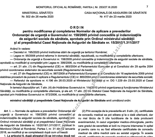 Ieri, 27 martie 2020, a fost publicat în Monitorul Oficial nr. 253 din 27.03.2020 – Ordinul ministrului sănătăţii şi al preşedintelui Casei Naţionale de Asigurări de Sănătate nr. 502/417 pentru modificarea şi completarea Normelor de aplicare a prevederilor Ordonanţei de Urgenţă a Guvernului nr. 158/2005 privind concediile şi indemnizaţiile de asigurări sociale de sănătate, aprobate prin Ordinul ministrului sănătăţii şi al preşedintelui Casei Naţionale de Asigurări de Sănătate nr. 15/2018/1311/2017.
