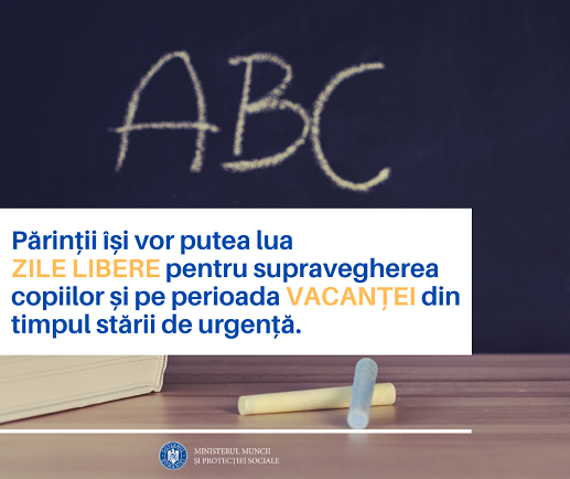 Părinții care își supraveghează la domiciliu copiii în vârstă de până la 12 ani după instituirea stării de urgență vor beneficia de zile libere și în timpul vacanțelor școlare. Guvernul a adoptat în acest sens o Ordonanță de Urgență care modifică art. 1 alin. (1) din HG nr. 217/2020 pentru aplicarea prevederilor Legii nr. 19/2020 privind acordarea unor zile libere părinţilor pentru supravegherea copiilor, în situaţia închiderii temporare a unităţilor de învăţământ.