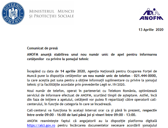Începând cu data de 14 aprilie 2020, Agenția Națională pentru Ocuparea Forței de Muncă pune la dispoziția cetățenilor un nou număr unic de telefon – 021.444-0000, la care aceștia pot suna pentru a obține informații suplimentare cu privire la șomajul tehnic și la facilitățile acordate prin prevederile Legii nr.19/2020.