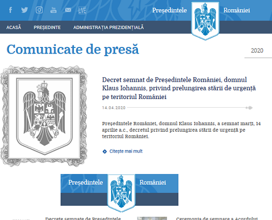 […] UPDATE (14.04.2020) – NEWS (Decret 240/2020) – Președintele României a semnat noul decret privind prelungirea stării de urgență pe teritoriul României (TEXT) – CLICK AICI […]