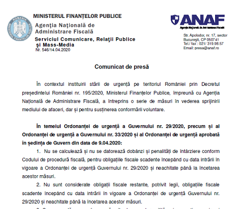 În contextul instituirii stării de urgență pe teritoriul României prin Decretul președintelui României nr. 195/2020 – TEXT AICI, Ministerul Finanțelor Publice, împreună cu Agenția Națională de Administrare Fiscală, a întreprins o serie de măsuri în vederea sprijinirii mediului de afaceri, dar și pentru susținerea conformării voluntare.