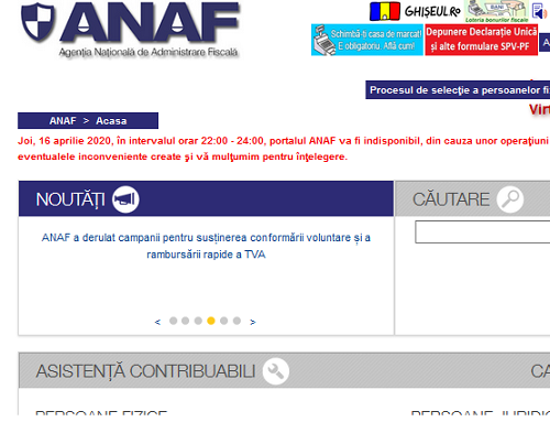 Potrivit unui comunicat recent al ANAF (postat pe site-ul oficial) – joi, 16 aprilie 2020, în intervalul orar 22:00 – 24:00, portalul ANAF va fi indisponibil, din cauza unor operaţiuni de mentenanţă.
