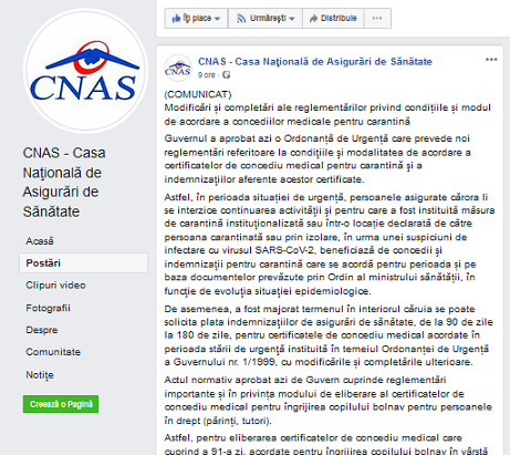 Vă reamintim că prin Ordinul ministrului sănătăţii şi al preşedintelui Casei Naţionale de Asigurări de Sănătate nr. 502/417/2020 au fost modificate și completate Normele de aplicare referitoare la concediile medicale și indemnizațiile de asigurări sociale de sănătate, iar Ordinul MS 414/2020 reglementează modul de instituire a măsurii de carantină pentru persoanele aflate în situația de urgență de sănătate publică internațională determinată de infecția cu COVID-19. Informațiile despre reglementările din cele două acte normative privind modul de acordare a concediilor medicale pe perioada stării de urgență au fost comunicate public în data de 27 martie și pot fi accesate pe pagina oficială de Internet a CNAS, link-ul: COMUNICAT – Noile prevederi privind modul de acordare a concediilor medicale au intrat în vigoare.