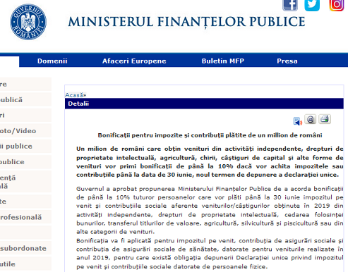 Guvernul a aprobat propunerea Ministerului Finanțelor Publice de a acorda bonificații de până la 10% tuturor persoanelor care vor plăti până la 30 iunie impozitul pe venit și contribuțiile sociale aferente veniturilor/câștigurilor obținute în 2019 din activități independente, drepturi de proprietate intelectuală, cedarea folosinței bunurilor, transferul titlurilor de valoare, agricultură, silvicultură și piscicultură sau din alte categorii de venituri.