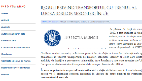 Inspectoratele Teritoriale de Muncă – informează agenții de plasare de forță de muncă în străinătate precum și lucrătorii interesați că, la data de 7 mai 2020, a fost publicat în Monitorul oficial nr. 367 – Ordinul nr. 951 privind privind aprobarea Procedurii pentru circulaţia trenurilor de călători special comandate în vederea transportului de lucrători sezonieri, inclusiv al celor care desfăşoară activităţi de îngrijire a persoanelor vulnerabile, între România şi alte state membre ale Uniunii Europene, pe perioada stării de urgenţă cauzate de pandemia de COVID-19.