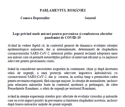 Va informam pe aceasta cale ca, in sedinta de Guvern de ieri a fost supus aprobarii un nou – PROIECT DE LEGE privind unele măsuri pentru prevenirea și combaterea efectelor pandemiei de COVID-19 – ce are ca obiect instituirea, pe durata stării de alertă declarate în condițiile legii, în vederea prevenirii și combaterii efectelor pandemiei de COVID-19, a unor măsuri temporare și, după caz, graduale, in:
