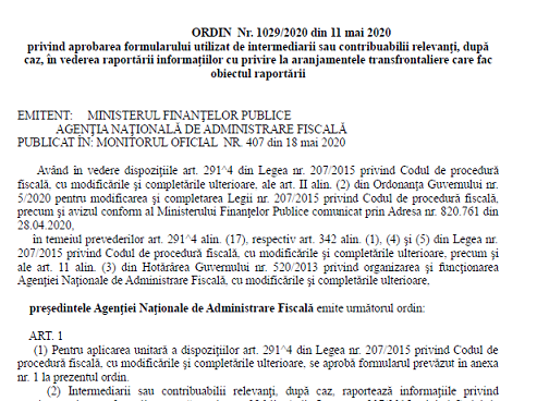 Stimati colegi, va informam ca, in Monitorul Oficial nr. 407 din 18 mai 2020, a fost publicat Ordinul președintelui ANAF nr. 1029 din 11 mai 2020 privind aprobarea formularului utilizat de intermediarii sau contribuabilii relevanţi, după caz, în vederea raportării informaţiilor cu privire la aranjamentele transfrontaliere care fac obiectul raportării.