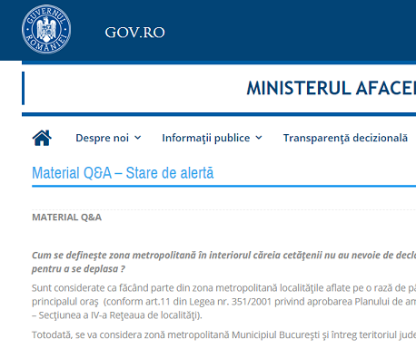 Potrivit materialului oficial „Material Q&A – Stare de alertă” – postat pe site-ul oficial al MAI – purtarea măștii care acoperă nasul și gura este obligatorie începând cu 15 mai 2020 în spațiile comerciale, mijloacele de transport în comun, la locul de muncă și în alte spații închise, potrivit anexei “Măsuri de prevenire și control a infecțiilor aplicabile pe durata stării de alertă”, atașată Hotărârii nr. 24 a CNSSU.