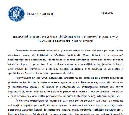 Prezentele recomandări orientative şi neexhaustive au fost elaborate pe baza liniilor directoare emise de Institutul de Sănătate Publică din Marea Britanie şi se adresează angajatorilor care organizează, coordonează şi conduc activitatea căminelor pentru persoane vârstnice. Aspectele prezentate în acest document au ca scop sprijinirea...Recomandări ITM (SARS-CoV-2) - pentru prevenirea răspândirii în căminele pentru persoane vârstnice