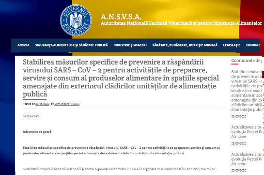 Ca urmare a măsurilor de relaxare stabilite la nivelul Guvernului, aplicabile începând cu data de 1 iunie 2020 și care vizează activitățile de preparare, servire și consum ale produselor alimentare în spațiile special amenajate din exteriorul unităților de alimentație publică, ANSVSA a adoptat, în data de 29.05.2020, împreună cu Ministerul Sănătății și Ministerul Economiei și Comerțului un nou Ordin (Ordinul comun MS/MEC/ANSVSA nr.966/1809/105/29.05.2020 publicat în MO 461/30.05.2020), care stabilește, pe de o parte cerințe adresate operatorilor din domeniu pentru organizarea și funcționarea adecvată a circuitelor de preparare și servire ale produselor alimentare în aceste unități și pentru protecția clienților și pe de altă parte măsurile de control stabilite de ANSVSA și MS pentru verificarea modului în care aceste cerințe sunt implementate.