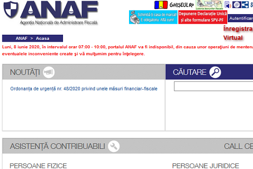 Potrivit unui comunicat recent al ANAF (postat pe site-ul oficial) – luni, 08 IUNIE 2020 (in Ziua de Rusalii), în intervalul orar 07:00 – 10:00, portalul ANAF va fi indisponibil, din cauza unor operaţiuni de mentenanţă.
