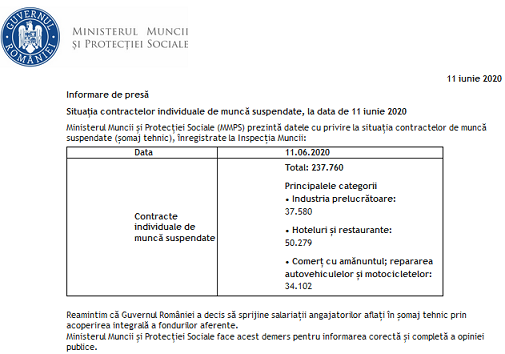 – Contracte individuale de muncă suspendate – 237.760 (cca. 600.000 ANTERIOR – la ultima raportare), din care: