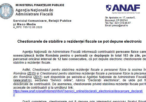 Agenţia Naţională de Administrare Fiscală informează contribuabilii persoane fizice care sosesc/pleacă în/din România pentru o perioadă ce depăşeşte în total 183 de zile, pe parcursul oricărui interval de 12 luni consecutive, că pot depune electronic chestionarele de stabilire a rezidenței fiscale.