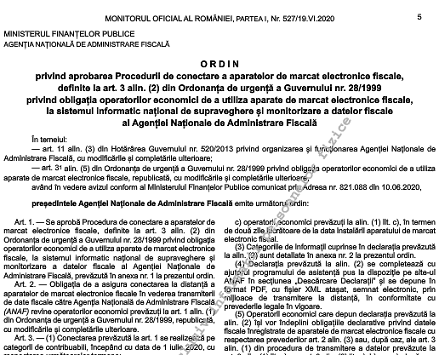 Va informam pe aceasta cale ca, in Monitorul Oficial nr. 527 din 19 iunie 2020 – a fost publicat Ordinul Președintelui ANAF nr. 2668 din 4 iunie 2020 privind aprobarea Procedurii de conectare a aparatelor de marcat electronice fiscale, definite la art. 3 alin. (2) din Ordonanţa de urgenţă a Guvernului nr. 28/1999 privind obligaţia operatorilor economici de a utiliza aparate de marcat electronice fiscale, la sistemul informatic naţional de supraveghere şi monitorizare a datelor fiscale al Agenţiei Naţionale de Administrare Fiscală.