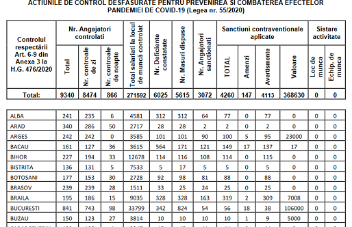 În perioada 20.05 – 10.07.2020, Inspecția Muncii a desfășurat acțiuni de control, pentru prevenirea si combaterea efectelor pandemiei de COVID-19, în conformitate cu prevederile Legii nr. 55/2020, în urma cărora inspectoratele teritoriale de muncă au aplicat 4.260 de sancțiuni contravenționale, din care amenzi în valoare totală de 368.630 lei, pentru 3.072 de angajatori sancționați din 9.340 de angajatori controlați.