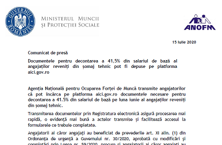Potrivit comunicatului postat pe pagina oficiala de Facebook a ANOFM – documentele pentru decontarea a 41,5% din salariul de bază al angajaților reveniți din șomaj tehnic pot fi depuse pe platforma aici.gov.ro – dupa cum am spus si noi aici – LINK.