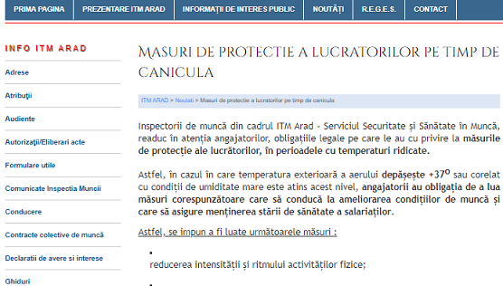 Inspectorii de muncă din cadrul ITM-urilor – Serviciul Securitate și Sănătate în Muncă, readuc în atenția angajatorilor, obligațiile legale pe care le au cu privire la măsurile de protecție ale lucrătorilor, în perioadele cu temperaturi ridicate.