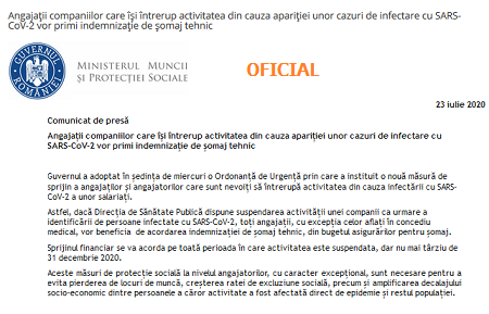 🔍 Astfel, dacă Direcția de Sănătate Publică dispune suspendarea activității unei companii ca urmare a identificării de persoane infectate cu SARS-CoV-2, toți angajații, cu excepția celor aflați în concediu medical, vor beneficia de acordarea indemnizației de șomaj tehnic, din bugetul asigurărilor pentru șomaj. 🔍