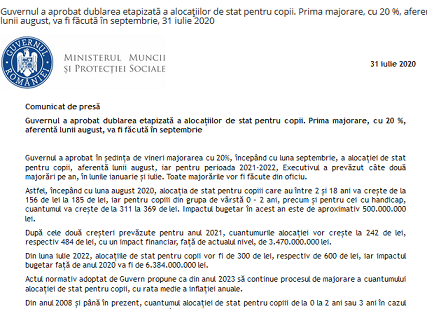 Guvernul a aprobat în ședința de vineri – majorarea cu 20%, începând cu luna septembrie, a alocației de stat pentru copii, aferentă lunii august, iar pentru perioada 2021-2022, Executivul a prevăzut câte două majorări pe an, în lunile ianuarie și iulie. Toate majorările vor fi făcute din oficiu.