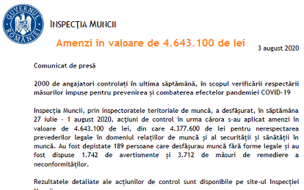 Inspecţia Muncii, prin inspectoratele teritoriale de muncă, a desfășurat, în săptămâna 27 iulie – 1 august 2020, acţiuni de control în urma cărora s-au aplicat amenzi în valoare de 4.643.100 de lei, din care 4.377.600 de lei pentru nerespectarea prevederilor legale în domeniul relațiilor de muncă și al securității și sănătății în muncă.