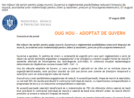 Guvernul a aprobat, în ședința de vineri, o ordonanță de urgență prin care sunt reglementate o serie de măsuri de sprijin destinate angajaților și angajatorilor și de stimulare a creșterii ocupării forței de muncă în domeniile afectate de întreruperea sau restrângerea activității – DUPA CUM AM SPUS SI AICI – în contextul situației epidemiologice determinate de răspândirea coronavirusului SARS – CoV – 2.