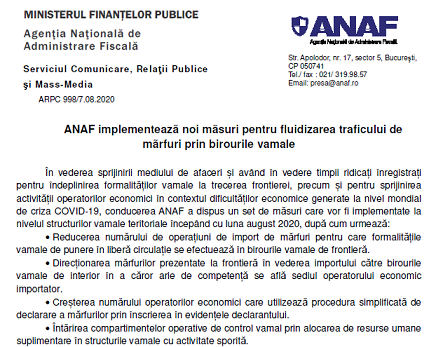 În vederea sprijinirii mediului de afaceri și având în vedere timpii ridicați înregistrați pentru îndeplinirea formalităților vamale la trecerea frontierei, precum și pentru sprijinirea activității operatorilor economici în contextul dificultăților economice generate la nivel mondial de criza COVID-19, conducerea ANAF a dispus un set de măsuri care vor fi implementate la nivelul structurilor vamale teritoriale începând cu luna august 2020, după cum urmează: