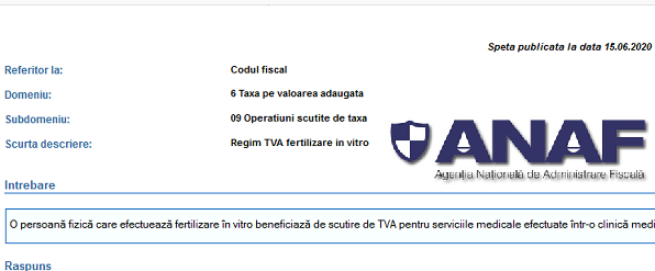 Prin urmare, pentru serviciile medicale de fertilizare în vitro se aplica scutirea de TVA prevăzută de Codul fiscal, numai în măsura în care sunt efectuate de unități autorizate pentru astfel de activități, în scopul tratării infertilității sau fertilității reduse, confirmată în baza diagnosticului unui medic specialist.