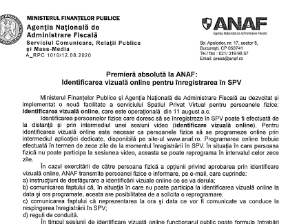 Ministerul Finanțelor Publice și Agenția Națională de Administrare Fiscală au dezvoltat și implementat o nouă facilitate a serviciului Spatiul Privat Virtual pentru persoanele fizice: identificarea vizuală online, care este operațională din 11 august a.c.