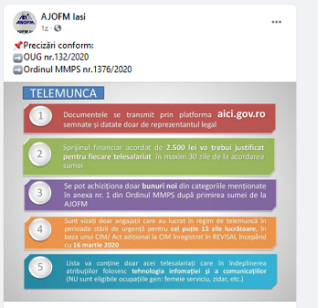 AJOFM Iasi – sursa – a publicat pe pagina oficiala de Facebook, un material avand la baza OUG nr.132/2020 si Ordinul MMPS nr.1376/2020 – material ce vine cu cateva clarificari in ceea ce priveste sprijinul pentru telemunca.