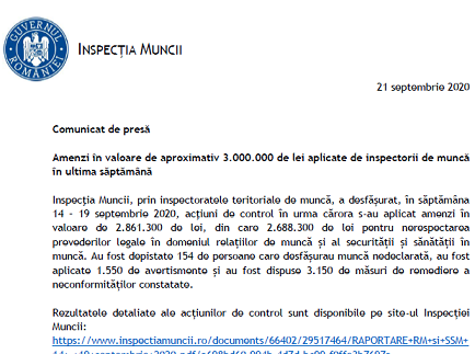 Inspecţia Muncii, prin inspectoratele teritoriale de muncă, a desfășurat, în săptămâna 14 – 19 septembrie 2020, acţiuni de control în urma cărora s-au aplicat amenzi în valoare de 2.861.300 de lei, din care 2.688.300 de lei pentru nerespectarea prevederilor legale în domeniul relațiilor de muncă și al securității și sănătății în muncă.