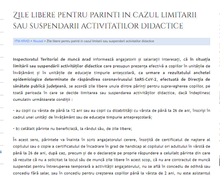 Inspectoratele Teritoriale de Muncă informează angajatorii și salariații interesați, că în situația limitării sau suspendării activităților didactice care presupun prezența efectivă a copiilor în unitățile de învățământ și în unitățile de educație timpurie anteșcolară, ca urmare a rezultatului anchetei epidemiologice determinate de răspândirea coronavirusului...Zile libere pentru părinți in cazul limitării sau suspendării activităților didactice - info oficial ITM