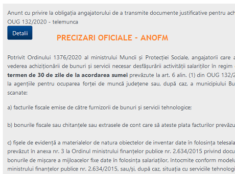 Potrivit Ordinului 1376/2020 al ministrului Muncii și Protecției Sociale, angajatorii care au beneficiat de sprijinul financiar acordat în vederea achiziționării de bunuri și servicii necesar desfășurării activității salariților în regim de telemuncă, au obligația de a transmite, în termen de 30 de zile de la acordarea sumei prevăzute la art. 6 alin. (1) din OUG 132/2020, prin încărcarea pe platforma aici.gov.ro, la agențiile pentru ocuparea forței de muncă județene sau, după caz, a municipiului București, următoarele documente justificative, scanate: