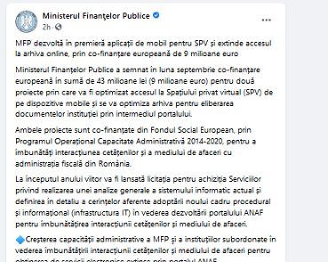 Ministerul Finanțelor Publice a semnat în luna septembrie co-finanțare europeană în sumă de 43 milioane lei (9 milioane euro) pentru două proiecte prin care va fi optimizat accesul la Spațiului privat virtual (SPV) de pe dispozitive mobile și se va optimiza arhiva pentru eliberarea documentelor instituției prin intermediul portalului.