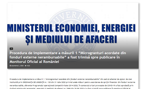 Procedura de implementare a măsurii 1 “Microgranturi acordate din fonduri externe nerambursabile” din cadrul schemei de ajutor de stat instituită prin ORDONANȚA DE URGENȚĂ nr. 130 din 31 iulie 2020– text aici – privind unele măsuri pentru acordarea de sprijin financiar din fonduri externe nerambursabile, aferente Programului operațional Competitivitate 2014-2020, în contextul crizei provocate de COVID-19 a fost aprobată prin Ordinul ministrului economiei, energiei și mediului de afaceri nr 2989 din 30.09.2020 și a fost trimisă spre publicare în Monitorul Oficial al României.
