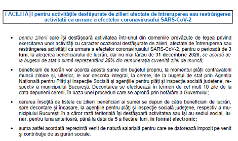 • pentru zilierii care îşi desfășoară activitatea într-unul din domeniile prevăzute de legea privind exercitarea unor activităţi cu caracter ocazional desfăşurate de zilieri, afectate de întreruperea sau restrângerea activității ca urmare a efectelor coronavirusului SARS-CoV-2, pentru o perioadă de 3 luni, la alegerea beneficiarului de lucrări, dar nu mai târziu de 31 decembrie 2020, se acordă de la bugetul de stat o sumă reprezentând 35% din remunerația cuvenită zilei de muncă;