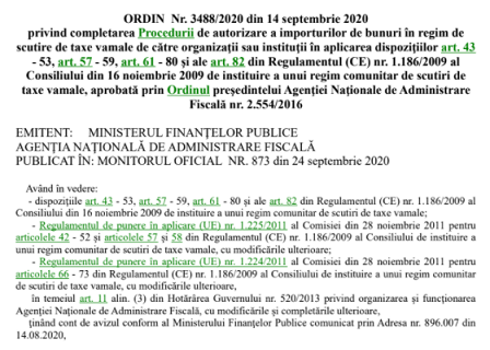 Stimati colegi, va informam ca, in Monitorul Oficial nr. 873 din 24 septembrie 2020, a fost publicat – Ordinul președintelui ANAF nr. 3488 din 14 septembrie 2020 – privind completarea Procedurii de autorizare a importurilor de bunuri în regim de scutire de taxe vamale de către organizaţii sau instituţii în aplicarea dispoziţiilor art. 43 – 53, art. 57 – 59, art. 61 – 80 şi ale art. 82 din Regulamentul (CE) nr. 1.186/2009 al Consiliului din 16 noiembrie 2009 de instituire a unui regim comunitar de scutiri de taxe vamale, aprobată prin Ordinul preşedintelui Agenţiei Naţionale de Administrare Fiscală nr. 2.554/2016.