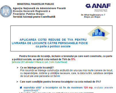 Va supunem atentiei un material oficial – elaborat de DGRFP Brasov (institutie careia ii multumim pentru posibilitatea preluarii informatiilor) – ce prezinta informatii cu privire la aplicarea cotei reduse de TVA pentru livrarea de locuinţe catre persoanele fizice ca parte a politicii sociale (material publicat în data de 12.08.2020).