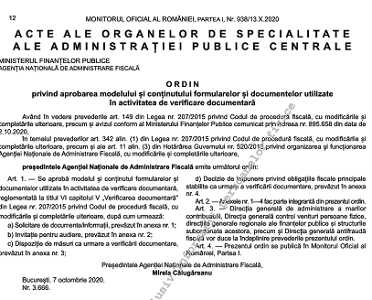 Stimati colegi, multumita membrilor de pe grupul – Contabili pe Facebook – va informam ca, in Monitorul Oficial nr. 938 din 13 Octombrie 2020, a fost publicat Ordinul Presedintelui Agenției Naționale de Administrare Fiscală nr. 3666 din 07 Octombrie 2020 – privind aprobarea modelului și conținutului formularelor și documentelor utilizate în activitatea de verificare documentară.