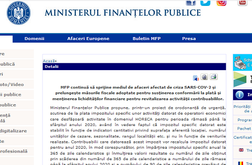 Ministerul Finanțelor Publice propune, printr-un proiect de orodonanță de urgență, scutirea de la plata impozitului specific unor activităţi datorat de operatorii economici care desfășoară activitate în domeniul HORECA pentru perioada rămasă până la sfârșitul anului 2020, având în vedere faptul că impozitul specific datorat este stabilit în funcție de indicatori cantitativi privind suprafața aferentă locației, numărul unităților de cazare, sezonalitate, rangul localității etc. și nu în funcție de veniturile realizate.