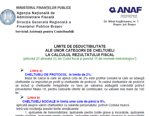 Va supunem atentiei un material oficial (6 pagini) – elaborat de DGRFP Brasov (institutie careia ii multumim pentru posibilitatea preluarii informatiilor) – ce prezinta informatii cu privire la limitele de deductibilitate ale unor categorii de cheltuieli la calculul rezultatului fiscal (material publicat în data de 26.10.2020).