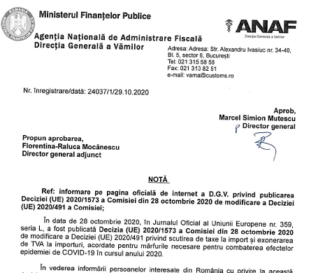 Directia Generala a Vamilor informeaza ca – in data de 28 octombrie 2020, in Jurnalul Oficial al Uniunii Europene nr. 359, seria L, a fost publicata Decizia (UE) 2020/1573 a Comisiei din 28 octombrie 2020 – de modificare a Deciziei (UE) 2020/491 – privind scutirea de taxe la import si exonerarea de TVA la importuri, acordate pentru marfurile necesare pentru combaterea efectelor epidemiei de COVID-19 in cursul anului 2020.