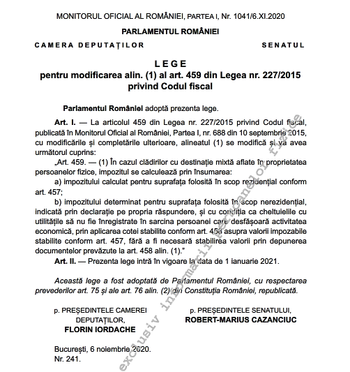 Legea nr. 241/2020 – pentru modificarea alin. (1) al art. 459 din Codul Fiscal (MO 1041/2020)