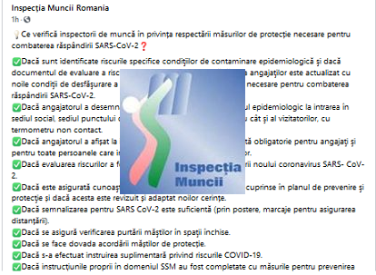 Inspecția Muncii Romania, prin intermediul Inspectoratul Teritorial de Muncă – Harghita, ne precizeaza din nou – ce verifică inspectorii de muncă în privința respectării măsurilor de protecție necesare pentru combaterea răspândirii SARS-CoV-2.