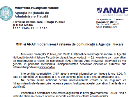 Ministerul Finanțelor Publice, prin Centrul Național de Informații Financiare, și Agenția Națională de Administrare Fiscală derulează, în perioada 21 – 22 noiembrie a.c., operațiuni de modernizare a rețelei de comunicații SAN (Storage Area Network), intervenții ce vor genera, în perioada menționată, indisponibilitatea serviciilor electronice furnizate prin intermediul portalului www.anaf.ro.