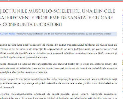 Începând cu luna iulie 2020 inspectorii de muncă din cadrul Inspectoratelor Teritoriale de Muncă – au întreprins vizite de lucru și de inspecție la angajatorii de pe raza fiecarui județ, pe parcursul lor fiind verificat modul de identificare a riscurilor care provoacă afecțiuni musculo-scheletice (AMS) precum și măsurile luate în vederea prevenirii acestora.
