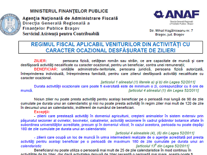 Va supunem atentiei un material oficial (3 pagini) – elaborat de DGRFP Brasov (institutie careia ii multumim pentru posibilitatea preluarii informatiilor) – ce prezinta o serie de informatii cu privire la regimul fiscal aplicabil veniturilor din activităţi cu caracter ocazional desfăsurate de zilieri