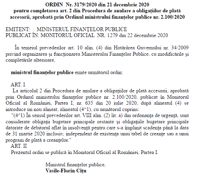 Va informam pe aceasta cale ca, in Monitorul Oficial nr. 1279 din 18 decembrie 2020, a fost publicat Ordinul ministrului finanțelor publice nr. 3179 din 21 decembrie 2020 – pentru completarea art. 2 din Procedura de anulare a obligaţiilor de plată accesorii, aprobată prin Ordinul ministrului finanţelor publice nr. 2.100/2020.