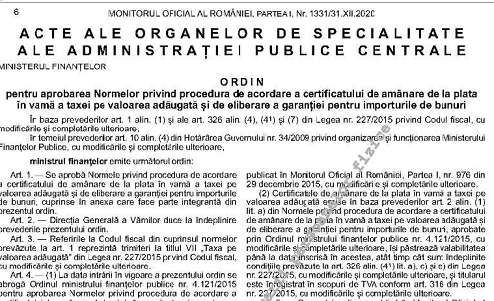 Dupa cum stiti deja, in Monitorul Oficial nr. 1331 din 31 decembrie 2020, a fost publicat Ordinul ministrului finanțelor nr. 3225 din 30 decembrie 2020 pentru aprobarea Normelor privind procedura de acordare a certificatului de amânare de la plata în vamă a taxei pe valoarea adăugată și de eliberare a garanției pentru importurile de bunuri.