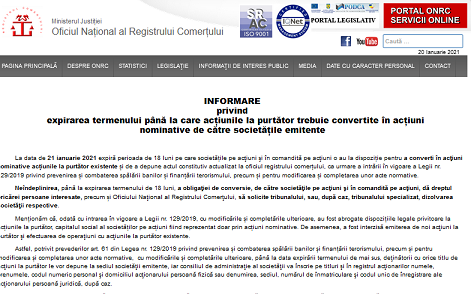 La data de 21 ianuarie 2021 expiră perioada de 18 luni pe care societățile pe acţiuni şi în comandită pe acţiuni o au la dispoziție pentru a converti în acţiuni nominative acțiunile la purtător existente și de a depune actul constitutiv actualizat la oficiul registrului comerțului, ca urmare a intrării în vigoare a Legii nr. 129/2019 privind prevenirea și combaterea spălării banilor și finanțării terorismului, precum și pentru modificarea și completarea unor acte normative.