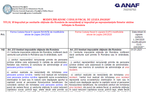 Va supunem atentiei un material oficial (9 pagini) – elaborat de DGRFP Brasov (institutie careia ii multumim pentru posibilitatea preluarii informatiilor) – ce prezinta sub forma de tabel comparativ, o serie de informatii cu privire la modificările aduse modificările aduse Codului fiscal de Legea 296/2020 – la Titlul VI „Impozitul pe veniturile obţinute din România de nerezidenţi şi impozitul pe reprezentanţele firmelor străine infiinţate in România” (material publicat în data de 11.01.2021).